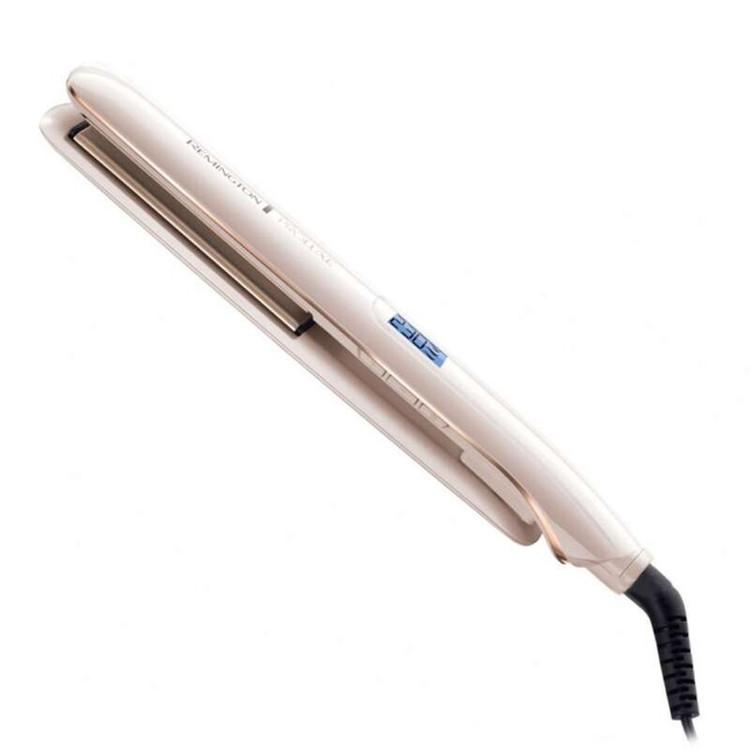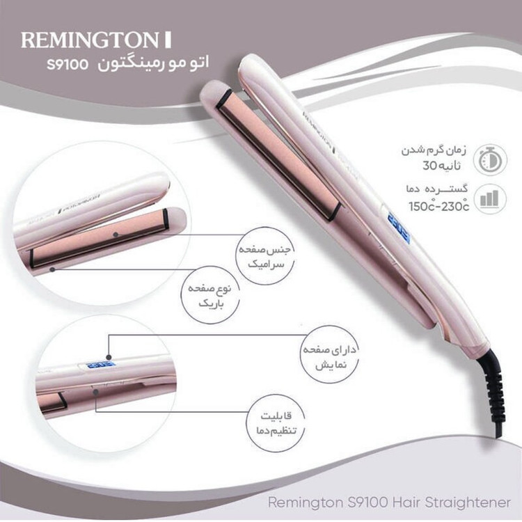 کاربری آسان و قابل استفاده برای آرایشگران حرفه ای دارای المنت سرامیکی تا 5 برابر صافی بیشتر مجهز به فناوری PRO+ بدون آسیب زدن به مو دارای حسگر حرارتی جهت تنظیم دمای مورد نظر قابل تنظیم روی 9 دمای مختلف از 150 تا 230 درجه دارای صفحات پهن برای اتو کشیدن بخش های بیشتر مدت زمان گرم شدن 30 ثانیه طراحی ارگونومیک دسته و بدون لغزش دارای سیم 1.6 متری اتو مو مدل S9100 رمینگتون REMINGTON تارهای مو را نسبت به سایر اتوهای موجود در بازار 5 برابر بیشتر صاف می کند و از وز شدن آن ها ممانعت به عمل می آورد. این محصول به فناوری PRO+ مجهز است که از آسیب دیدن و سوختن مو جلوگیری کرده و دما را به صورت میانگین رو 185 درجه سانتی گراد ثابت نگه می دارد با این حال این اتو مو می تواند روی 9 دمای مختلف از 150 درجه تا 230 درجه تنظیم گردد. حداکثر زمان برای گرم شدن دستگاه 30 ثانیه بوده و شما می توانید پس از آن از کارایی محصول مطمئن باشید. این اتو مو کاربری بسیار ساده دارد و سیم 1.6 متری آن به خانم ها و آرایشگران امکان کار راحت می دهد.