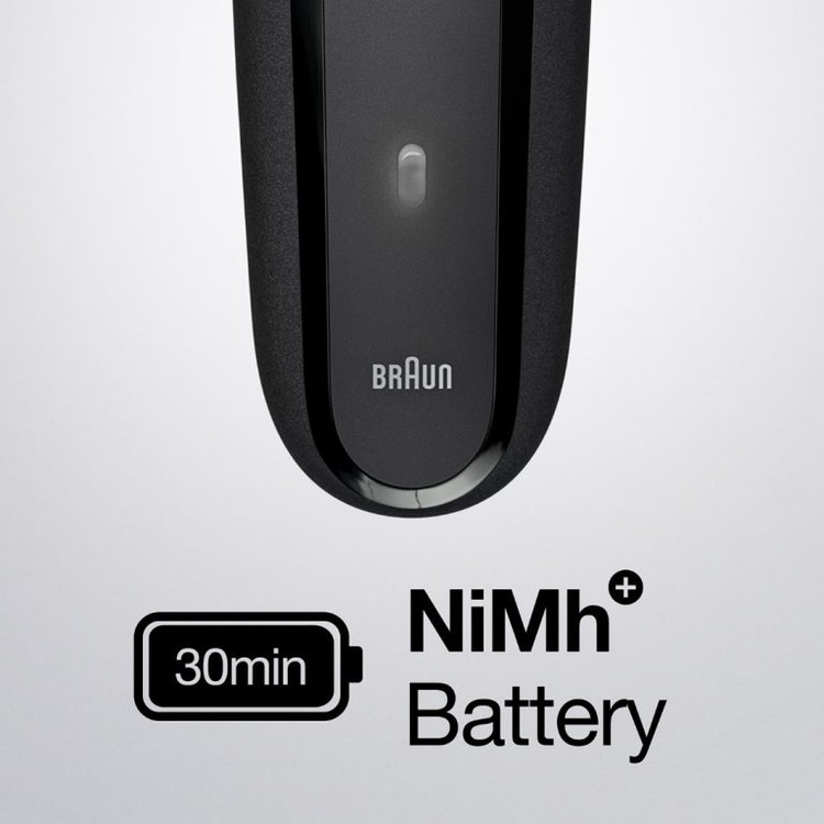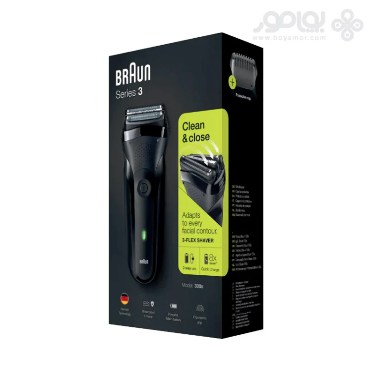 براون سری 3 ریش تراشی کاملا ضد آب و دارای گواهینامه IPX7 و ضد آب تا 5 متر می باشد. این امر شستشو و پاکسازی این محصول را برای شما راحت تر می کند. باتری نیکلی قدرتمند در مدل 300S از نوع نیکلی با 8 برابر قدرت شارژ سریع می باشد و می تواند در عرض 1 ساعت شارژ تا 20 دقیقه بدون نیاز به برق بصورت بی سیم کار کند. همچنین دارای شارژ سریع 5 دقیقه ای برای یکبار اصلاح می باشد.