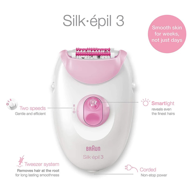 برای دقت بیشتر در اصلاح موهای زائد اپیلاتور براون سری 3 دارای تکنولوژی SoftLift Tips است که موهای خوابیده را بلند کرده و برای برداشتن راحت تر به طرف موچین ها هدایت می کند. این فناوری باعث می شود که در هر حرکت موهای بیشتری از ریشه برداشته شود. دیگر حتی یک مو را هم از دست نمی دهید. ویژگی خاص اپیلاتور سری 3 براون چراغ هوشمند است. چراغ LED حتی ریزترین و شفاف ترین موها را هم آشکار می کند، پس به راحتی می توانید مطمئن شوید که همه آنها برای مدت طولانی از بین رفته اند.