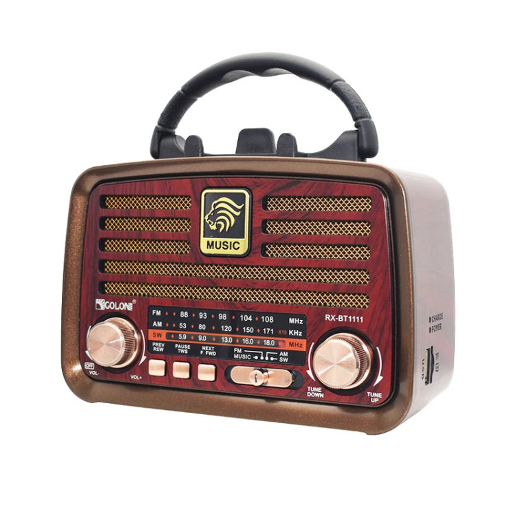با وجود پیشرفت تکنولوژی باز هم رادیو طرفداران خاص خودش را دارد. رادیو RX-BT1111 رادیویی زیبا و جذاب با امکانات پیشرفته امروزی با طرح نوستالژیک خود به صورت رادیو های قدیمی، یادآور خاطرات بسیار شیرینی است. در این دستگاه نمایشگر تنظیم ایستگاه رادیویی مانند نسل رادیوهای قدیمی طراحی شده است . این رادیو اسپیکر گیرنده امواج رادیویی FM، AM و SW می باشد و قابلیت پشتیبانی از USB و TF CARD را داشته و همچنین دارای قابلیت اتصال بلوتوث می باشد. انرژی این رادیو به 3 صورت قابل تامین است:برق مستقیم شهری،باتری داخلی قابل شارژ و یا 2 عدد باتری قلمی بزرگ.این رادیو در همه جا میتواند همراه خوبی برای شما باشد. این رادیو با داشتن آنتن تلسکوپی بر روی خود به راحتی میتواند در هر مکانی به ایستگاه رادیویی دلخواه شما متصل و شما را با پخش رادیو لذت خاصی دهد.همچنین وجود دسته بر روی بدنه حمل این رادیو را راحت کرده است.