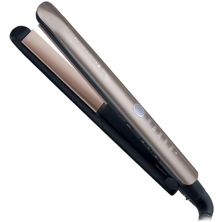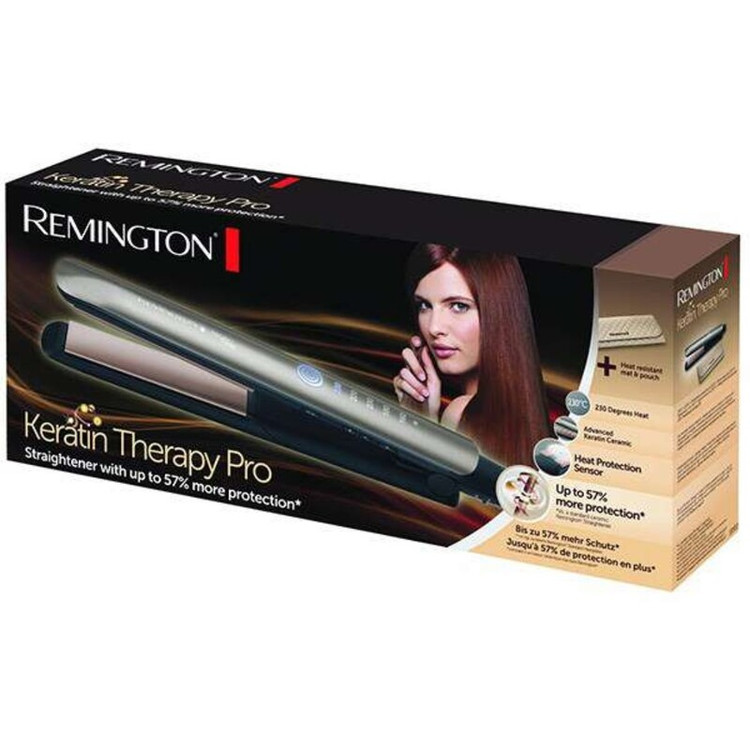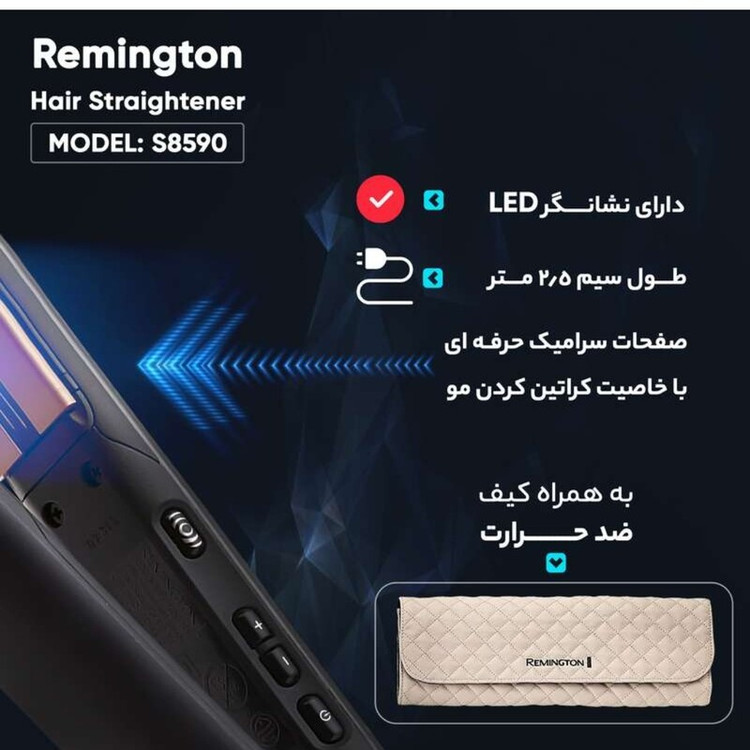 اتو موی S8590 رمینگتون از جمله نمونههایی در این کمپانی است که علاوه بر داشتن تکنولوژیهای روز دنیا دارای خاصیت درمانی نیز میباشد. در این محصول از بهترین نوع خصوصیات درمان یعنی کراتین درمانی استفاده شده است. کراتین درمانی چیست؟از دست رفتن کراتین داخل مو اصلیترین دلیل بروز خشکی، شکنندگی و آسیب دیدگی آن است، به دلیل داشتن همین خصوصیت موهای شما در برابر آسیب دیدگی و شکنندگی تا 57% محافظت شده و دیگر با مصرف اتوی مو احساس پشیمانی و یا نگرانی نخواهید کرد.S8590 دارای صفحات 110 میلی متری بوده که صفحه ای بلند در اتوها بشمار میرود. در تمامی اتو موهای رمینگتون گرم شدن سریع (15 ثانیه ای) صفحات از محسنات آنها به حساب میآید که در این مدل نیز این حسن دیده میشود، ضمن اینکه پس از 15 ثانیه بوق هشدار نیز برای اطلاع دادن به مصرف کننده در نظر گرفته شده است.بر روی بدنهی این دستگاه 5 دمای متفاوت از 160 تا 230 درجهی سانتی گراد دیده میشود که با تنظیم هر دما نور LED تعبیه شده در زیر آن روشن میشود.سنسور حرارتی اما سیستم جدیدی که تنها در این مدل قابل رویت است وجود سنسور حرارتی است. در این مدل علاوه بر اینکه کابر میتواند دمای اتو را به سلیقهی خود انتخاب کند با فشار دادن دکمه ای که در کنار دستگاه وجود دارد سنسور فعال شده و توسط قسمت باریکی که در صفحهی بالای اتو طراحی شده با توجه به جنس مو دمای مناسب را تنظیم میکند.در اکثر اتوهای جدید موجود در بازار امکان قفل دما با نگه داشتن دکمهی (-) که برای کم کردن دماست ممکن میشود که از تغییر احتمالی دما در حین استفاده جلوگیری میکند.سیستم ایمنی خاموش کردن خودکار نیز در این دستگاه وجود دارد که در صورت مورد استفاده قرار نگرفتن اتو پس از 60 ثانیه خاموش میشود.یک ضامن برای بستن بازوها نیز تعبیه شده که برای قرار دادن دستگاه در کیف بسیار جذاب آن کارایی خوبی دارد. این کیف مقاوم در برابر گرماست و گرمای اتو به آن آسیبی نمیرساند.در کنار تمامی خصوصیات قید شده وجود کیفی ضد حرارت و بسیار لوکس این اتو را به انتخابی ایده آل تبدیل کرده است.