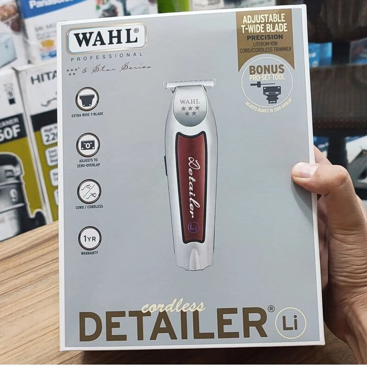 ماشین اصلاح خط زن شارژی وال دیتیلر لی Wahl Detailer Li 5-Star Cord/Cordless Trimmer ماشین اصلاحی خط زن است و عملکردی سریع و قوی دارد که بسیار استفاده از آن را آسان میکند. ماشین اصلاح سر و صورت وال 8171 دارای باتری لیتیوم یونی است که توان شارژ دهی و عملکرد مناسب را تا 100 دقیقه دارد و بوسیله استند شارژر پس از 2 ساعت به شارژ کامل میرسد. ماشین اصلاح وال Wahl Detailer Li مجهز به سه سری مختلف، برس تمیز کننده، محافظ تیغه، برس پیش از تراشیدن، ترانسفورماتور شارژ، روغن، دستور العمل کار و محافظ تیغه است که بسیار کاربردی و با کیفیت می باشند. ماشین اصلاح Wahl 5-Star Cord/Cordless Detailer Li 8171 مناسب برای استفاده در خانه و یا هنگام سفر است. ماشین اصلاح وال دیتیلر لی قابلیت استفاده در دو حالت با سیم و یا بدون سیم یعنی توسط باتری دارد. طول ماشین اصلاح 14 سانتی متر و وزنی معادل 187 گرم دارد.